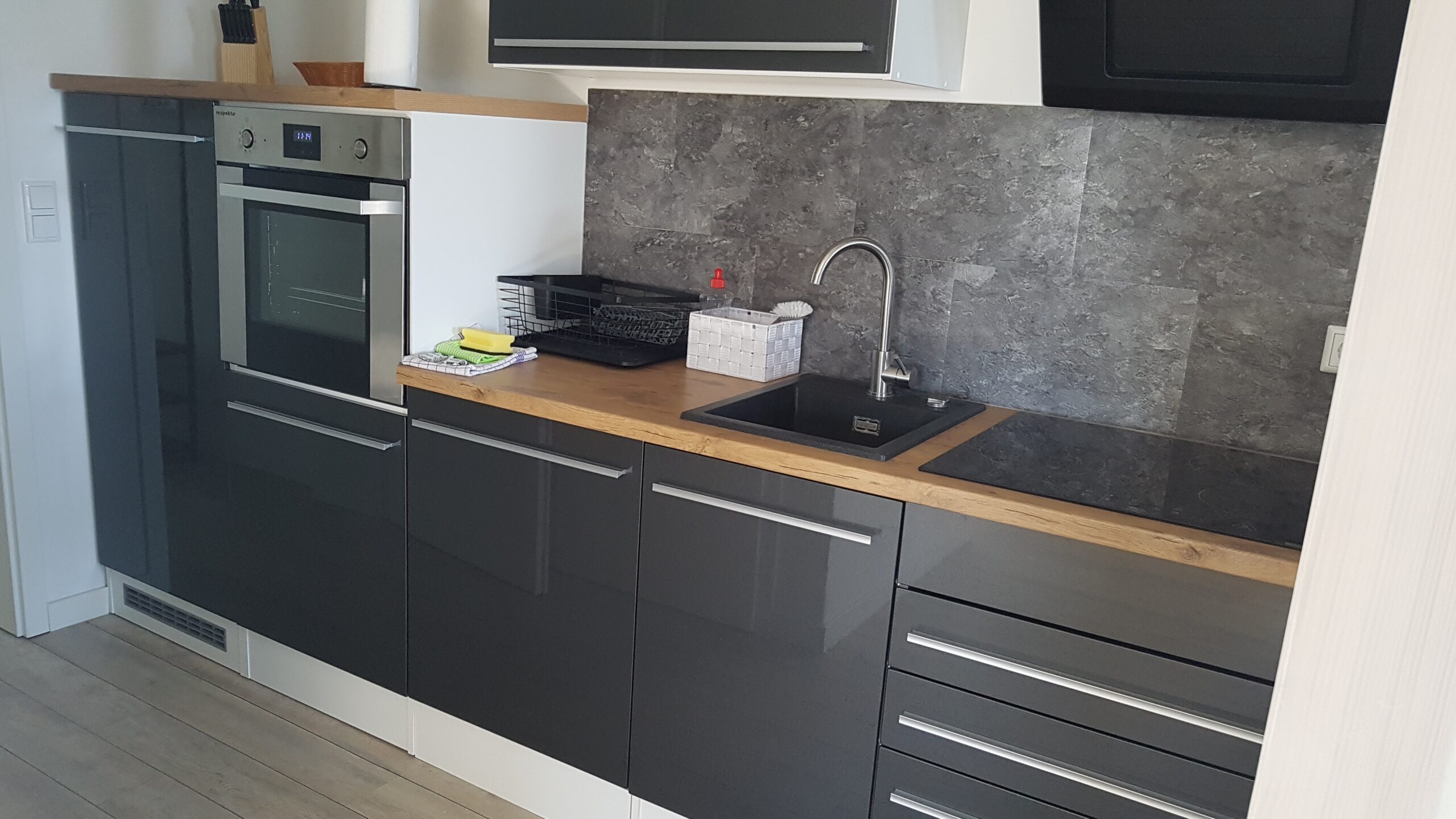 - moderne Einbauküche mit Kühl-Gefrierkombination, Backofen Herd mit Ceranfeld und Geschirrspüler