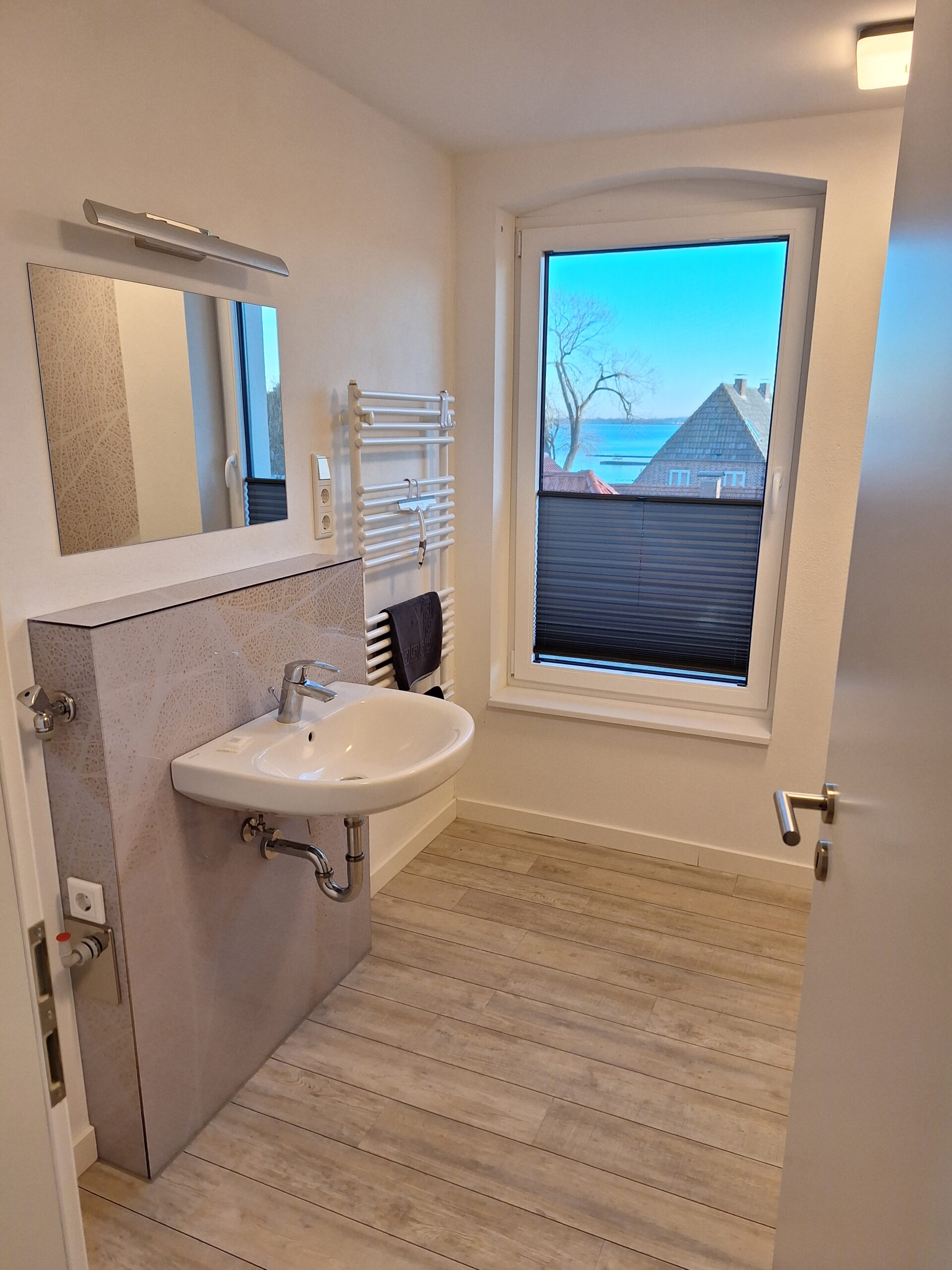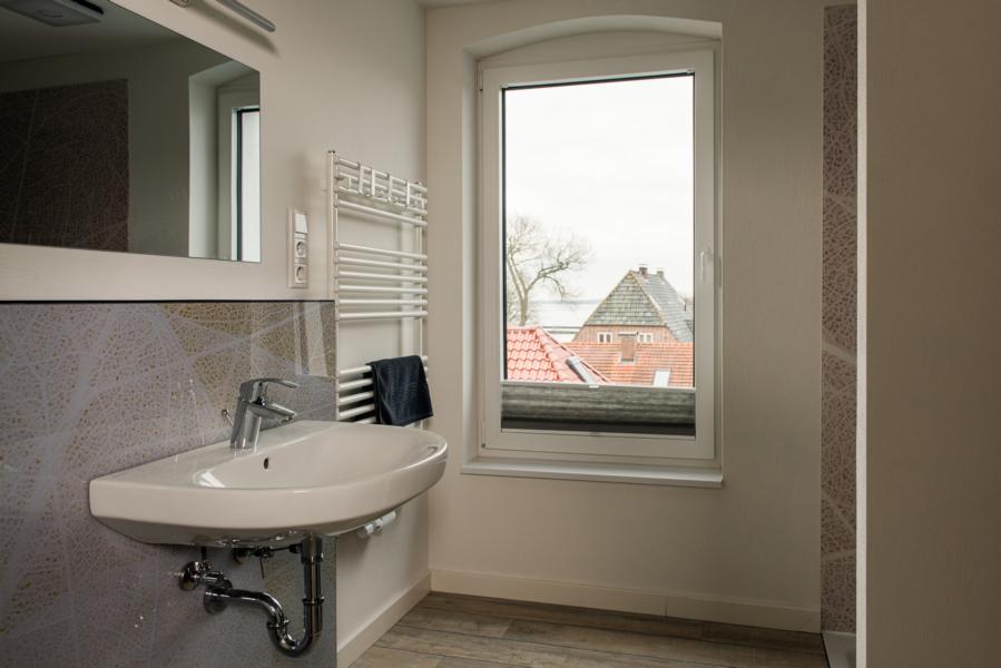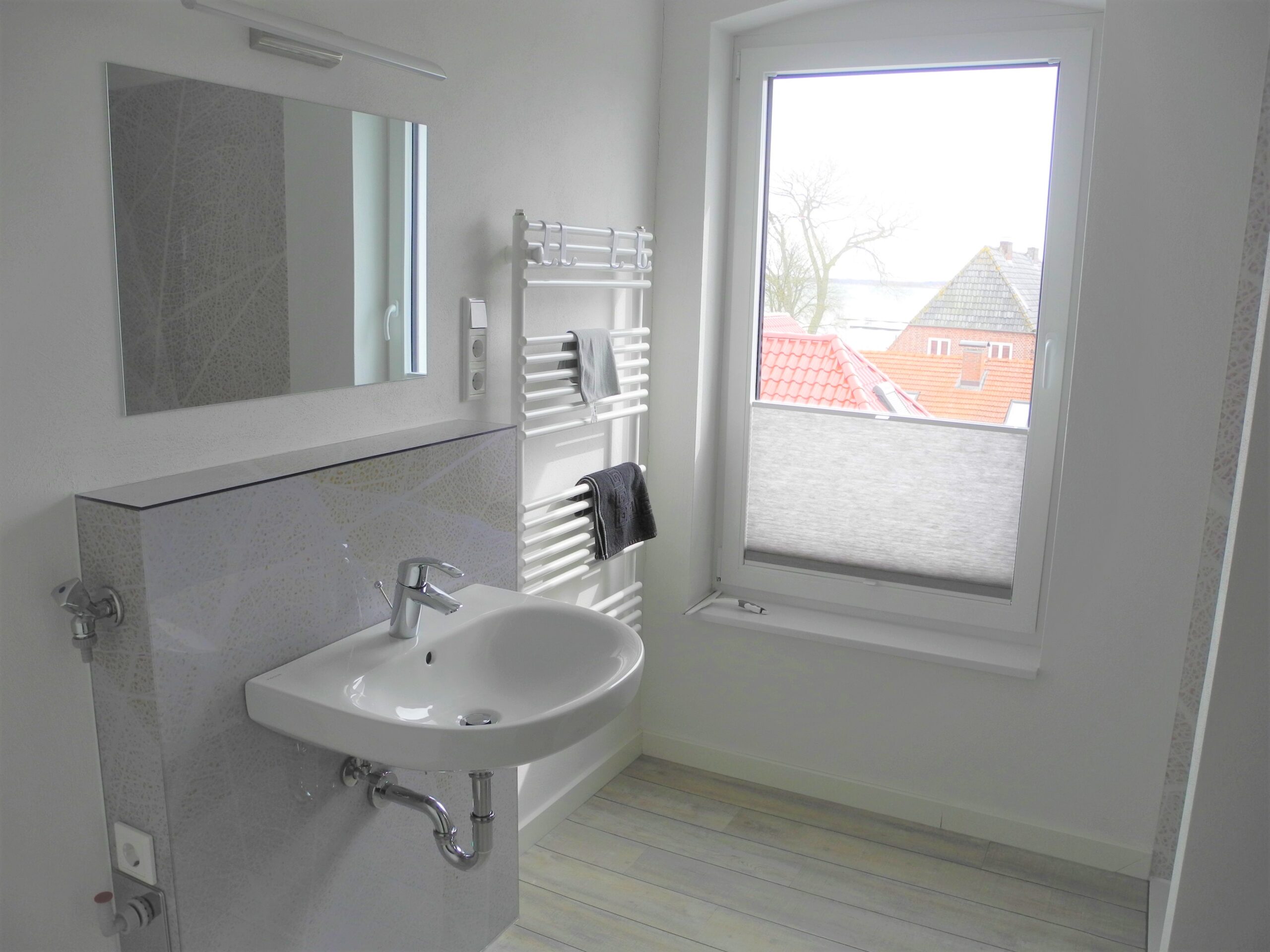 - große offene Flach-Regendusche 90x120cm, Handtuchheizkörper, WC, Waschbecken, Spiegel und Fön