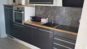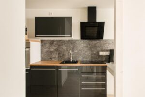 -  moderne Einbauküche mit Kühl-Gefrierkombination, Backofen Herd mit Ceranfeld und Geschirrspüler