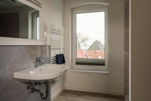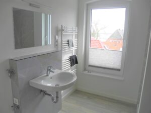 -  große offene  Flach-Regendusche 90x120cm, Handtuchheizkörper, WC, Waschbecken, Spiegel und Fön