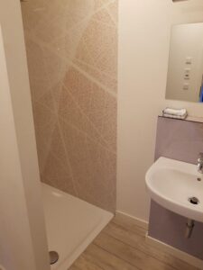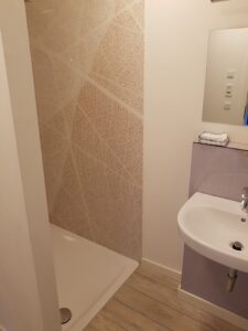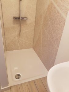 - große offene Flach-Regendusche 90x120cm, Handtuchheizkörper, WC, Waschbecken, Spiegel und Fön