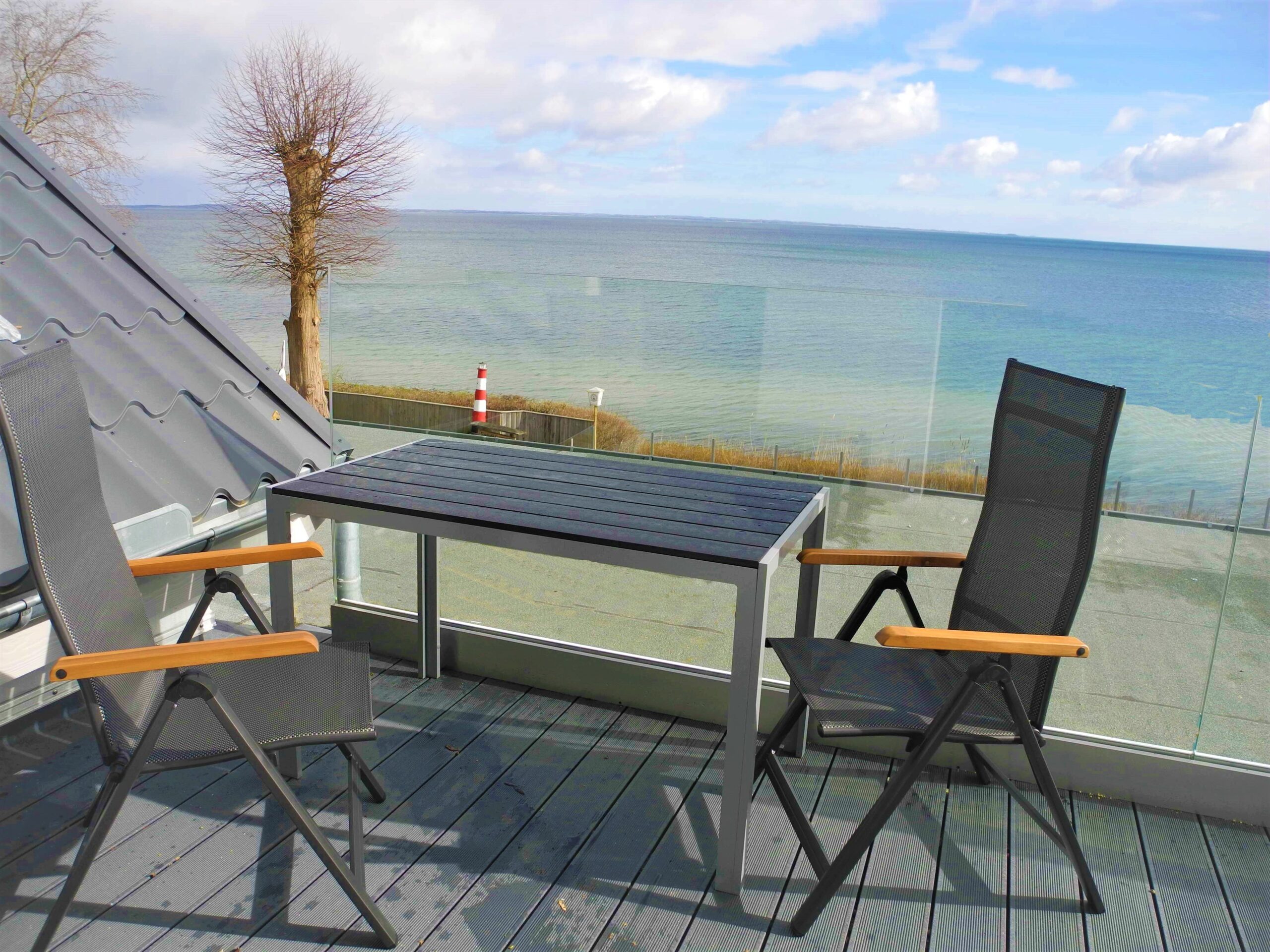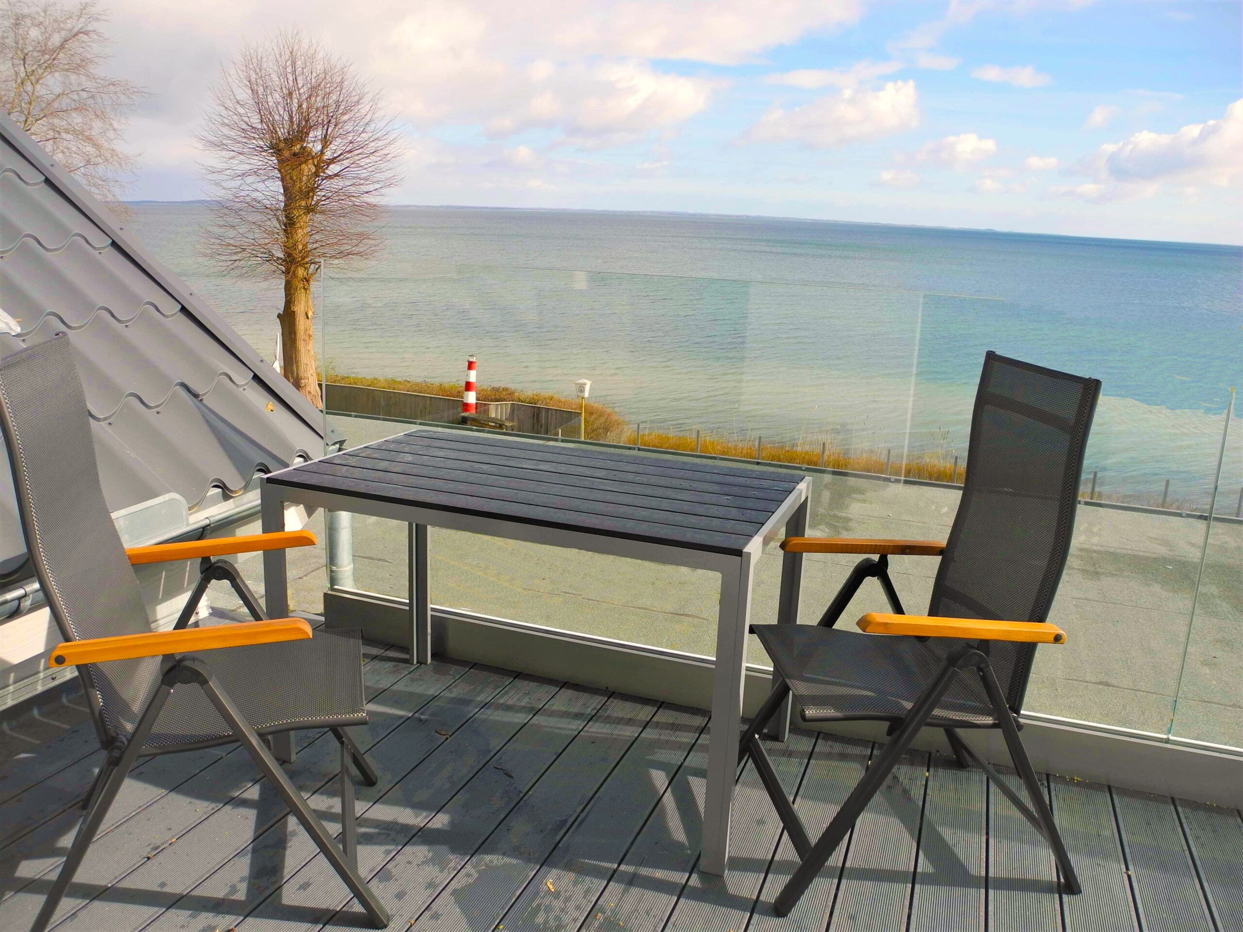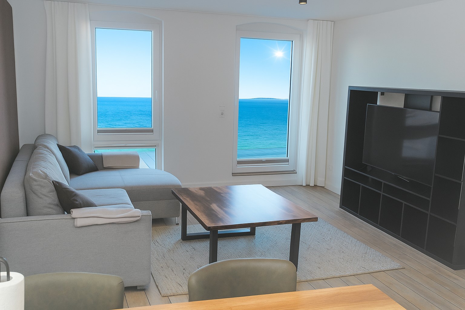 70m2 Panorama-Meerblick-Appartment mit 12m2 großer Glas Dachterrasse im Obergeschoss.