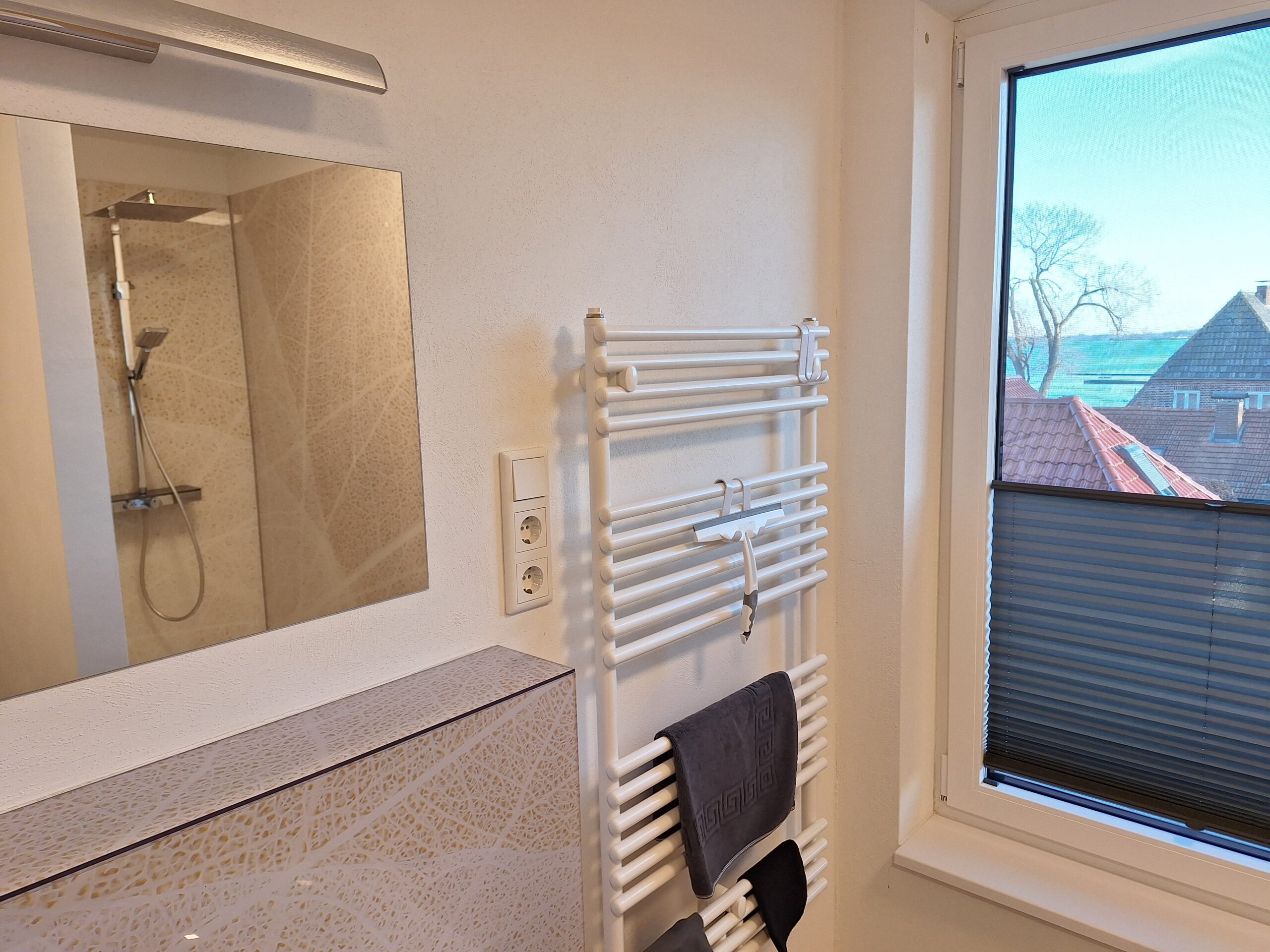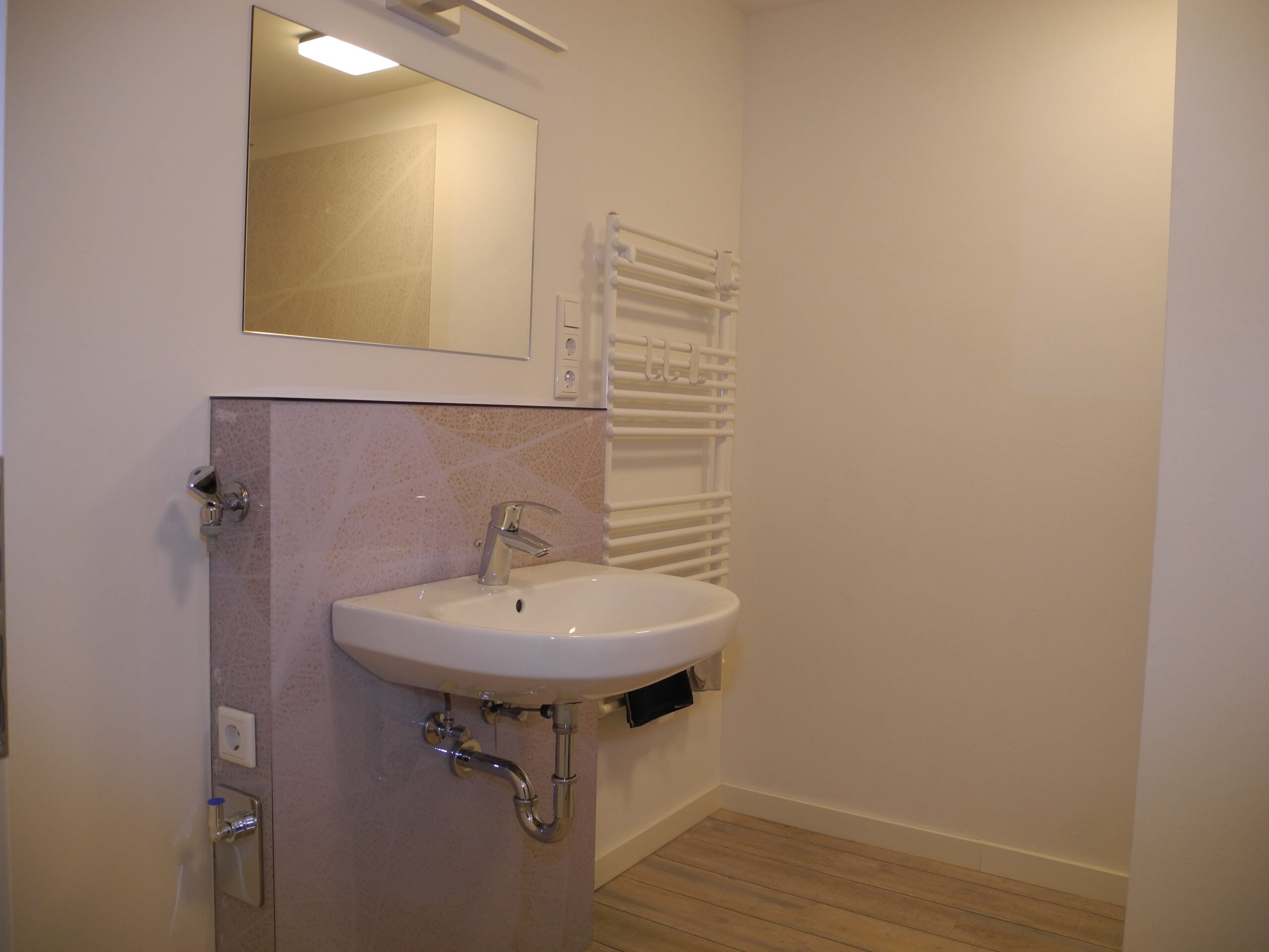 - große offene Flach-Regendusche 90x120cm, Handtuchheizkörper, WC, Waschbecken, Spiegel und Fön
